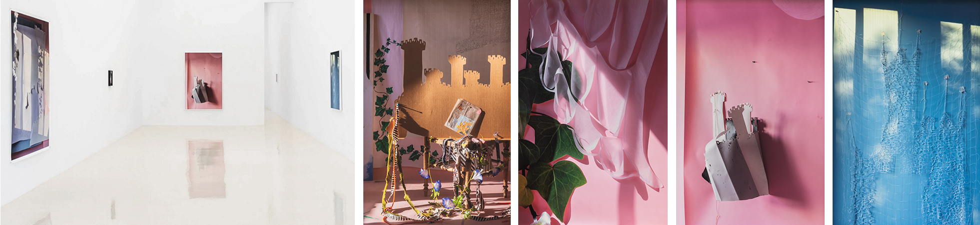 Moving from small to large is the mural sized photograph Leaves. Though no castle is depicted in this image, a lacy white transparent piece of silk flutters in the light against a pink wall that contrasts with actual green vines that hug the left side of the picture. Pink is also the predominant color of Keep. Push-pinned to a piece of pink seamless backdrop paper is a paper castle twisted to emphasize its three-dimensional form. A single piece of twine hangs from the tack that holds the castle in place and dangles down until it is cropped by the bottom of the composition. The castle is in rough shape as if it has seen better days, a relic of another place and time.