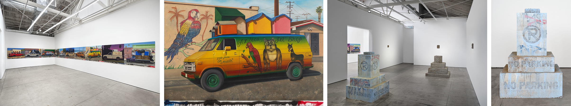 In Los Angeles, it is commonplace to walk by a parked vehicle and wonder how long it has been there or why it is not ticketed even though there is a visible no parking sign right beside it. The car or truck could be ancient and dilapidated, or shiny and new, or even hidden under a blanket. Alfonso Gonzalez Jr. examines the personalities of these vehicles in No Parking, while painting them in situ with a sign painter's skill and capturing them in their surroundings. Ten paintings are butted together and span two walls to create a long L-shaped mural. Gonzalez Jr. leaves a white border at the bottom of each work on which he sprays black or red lines with drips that cascade down the surface. This undulating line ties the paintings together, making them in essence one work, while simultaneously linking them back to the street.