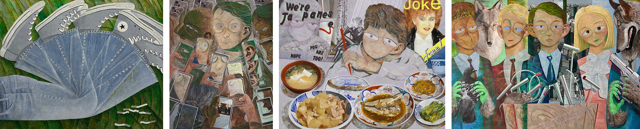 Koichi Enomoto is a Japanese artist living outside Toyko in Kanagawa, Japan whose figurative paintings blend manga and anime-styled characters that are quirky in some ways, yet also realistic. Often combining Japanese and American references, he freely borrows from different aspects of pop culture, be it art, music, or politics. The resulting paintings simultaneously allude to the present and the past. He also has an interesting perspective on the history of art, as some of his compositions draw from Cubism and Futurism. These — specifically Chill time, alone (all works 2025) and A person who may be falsely accused — are among the highlights of the exhibition.