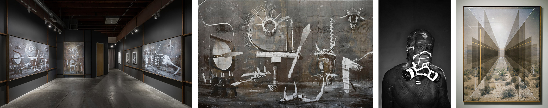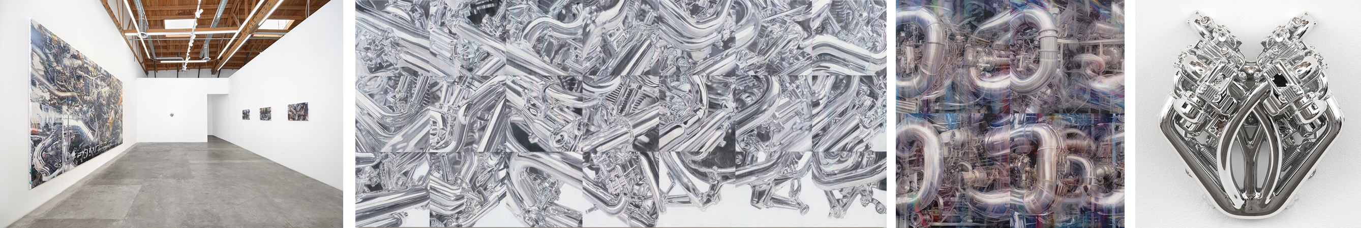 In Los Angeles, it is commonplace to walk by a parked vehicle and wonder how long it has been there or why it is not ticketed even though there is a visible no parking sign right beside it. The car or truck could be ancient and dilapidated, or shiny and new, or even hidden under a blanket. Alfonso Gonzalez Jr. examines the personalities of these vehicles in No Parking, while painting them in situ with a sign painter's skill and capturing them in their surroundings. Ten paintings are butted together and span two walls to create a long L-shaped mural. Gonzalez Jr. leaves a white border at the bottom of each work on which he sprays black or red lines with drips that cascade down the surface. This undulating line ties the paintings together, making them in essence one work, while simultaneously linking them back to the street.