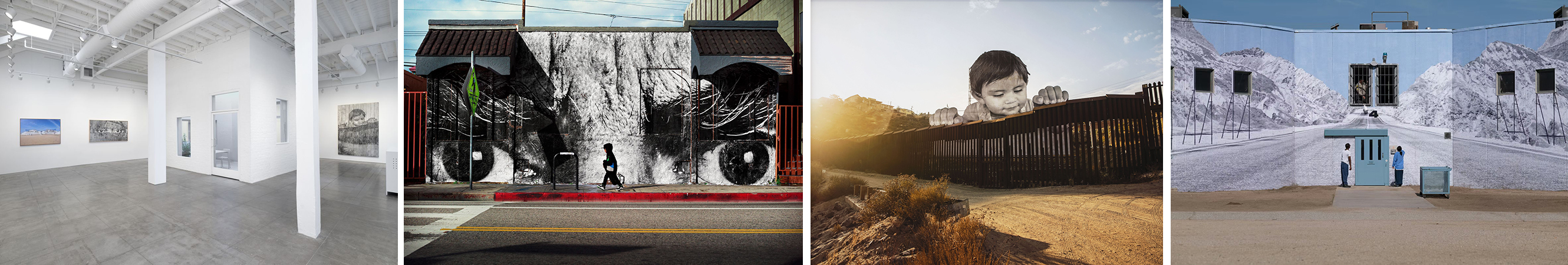 In 2017, JR traveled to Tecate, Mexico and created a work about the border with the United States. Here, a giant image of a toddler peers over the border wall forcing viewers to think about the relationship between a child' playing peek-a-boo over the wall versus the loaded issue of immigration. For another California based series, JR collaborated with the correctional facility in Tehachapi (located two hours north of Los Angeles) where he photographed inmates, as well as recorded their stories. During return visits, he worked with the inmates to create large murals. Tehachapi, The Road, Anamorphosis, #1, USA (2022), depicts a receding road that suggests a way out of prison. In Tehachapi, Picnic, Ruett Foster, USA (2022), a pair of giant eyes — belonging to the victim of a violent crime — that when seen from the sky, serves as the background during a picnic celebrating the participants of the project. In Giants, Death Valley, Billboard, Mars 5, 2017, 9:46 am, California, USA (2017), a black and white photographic mural that depicts the contour of the "real" mountains behind it. It is placed on top of a gate in the barren desert landscape so the documentation allows for perfect alignment.